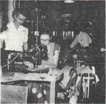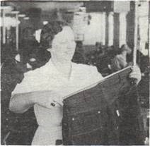 The top floor, perhaps the liveliest floor, where surging (individual pattern pieces being joined in a continuous chain), ticket making (sewing a leather ticket on the “W” trademark hip pocket), joining (joining left and right front of the garment), felling (joining the front and back half together), zipper tacking and waistbanding, all of these steps kept busy feminine fingers flying in the sewing department. Prior to and during World War II, sewing machines occupied nearly the entire floor. After the war, the number of machines was reduced. The demand for combat pants, jungle suits, regulation khaki dress pants and shirts, and fatigue clothing had ceased. Government workers returned to their home offices. Blue Bell resumed the manufacture of work clothes and also diversified into children’s play clothes and casual apparel for women. The initial use of the stopwatch and slide rule had led to assembly-line production of the first order.