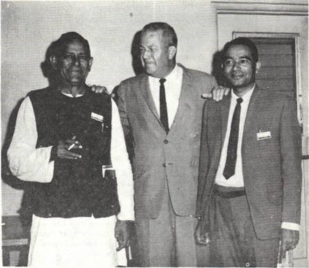 INDIAN GUESTS TOURED Blue Bell with Roy Duncan, manager, serving as their guide. Thirteen members of the Indian delegation of the Farmers and World Affairs, Inc. were present. This was part of a Farm Leader Exchange serving as a people to people exchange to promote world peace through mutual understanding. Mr. and Mrs. Lawrence Harvey served as local hosts for the 1966 visit. [Photo courtesy of Susie Sexton.]